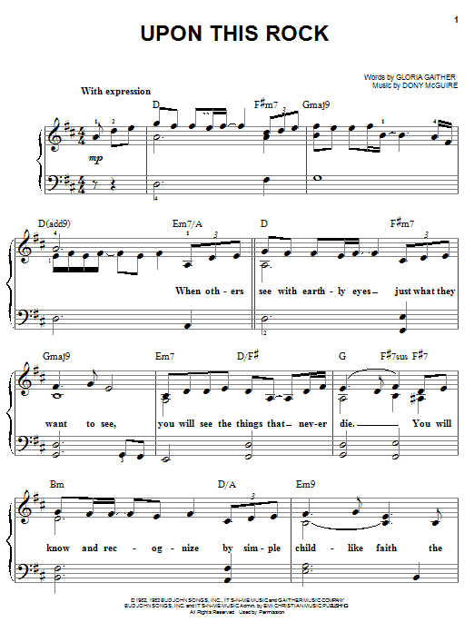 Download or print Bill & Gloria Gaither Upon This Rock sheet music, chords and digital score arranged for Piano, Vocal & Guitar Chords (Right-Hand Melody). This Christian score includes 6 page(s).