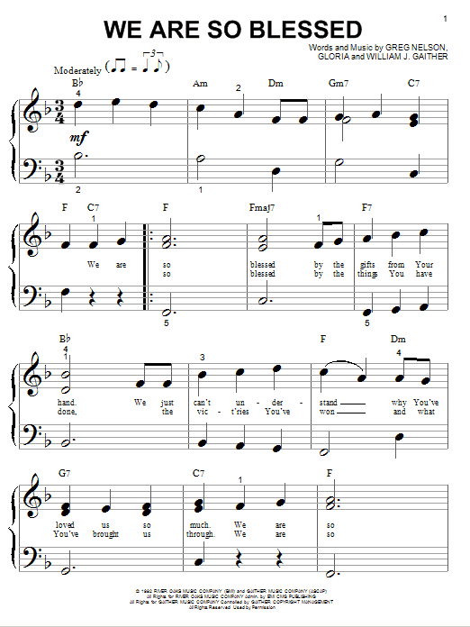 Download or print Bill & Gloria Gaither We Are So Blessed sheet music, chords and digital score arranged for Big Note Piano. This Gospel score includes 3 page(s).