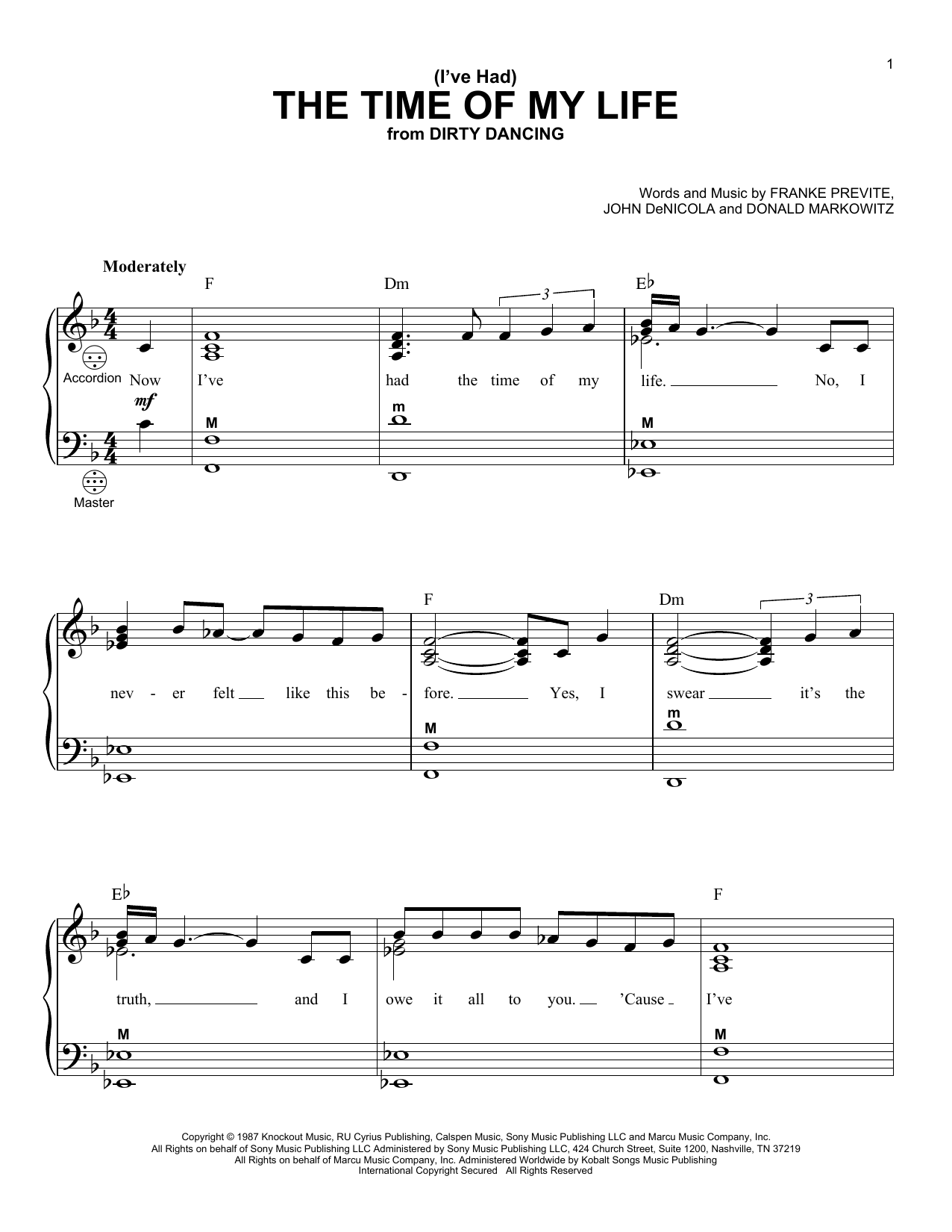 Download or print Bill Medley & Jennifer Warnes (I've Had) The Time Of My Life (from Dirty Dancing) sheet music, chords and digital score arranged for Accordion. This Pop score includes 5 page(s).