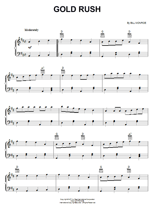 Download or print Bill Monroe Gold Rush sheet music, chords and digital score arranged for Piano Solo. This Blues score includes 2 page(s).