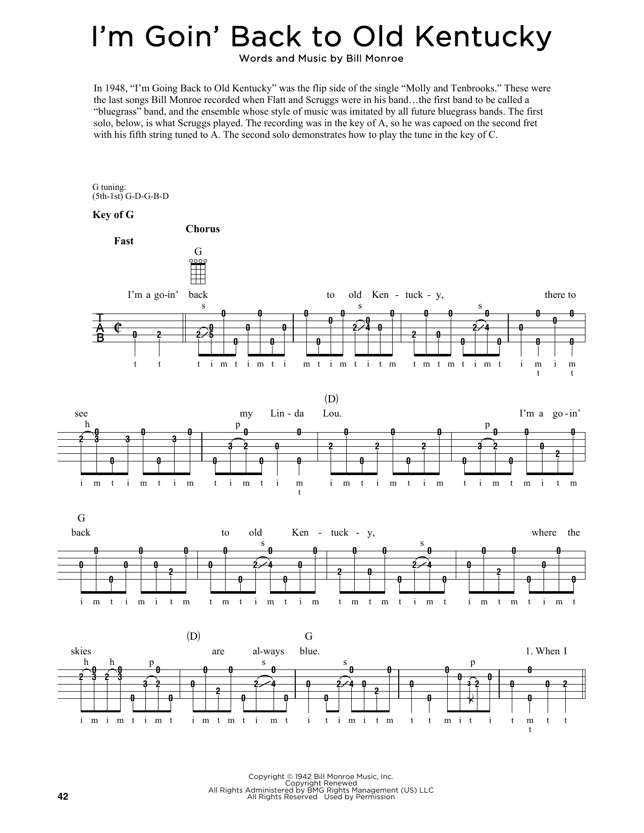 Download or print Bill Monroe I'm Goin' Back To Old Kentucky (arr. Fred Sokolow) sheet music, chords and digital score arranged for Banjo Tab. This Jazz score includes 2 page(s).