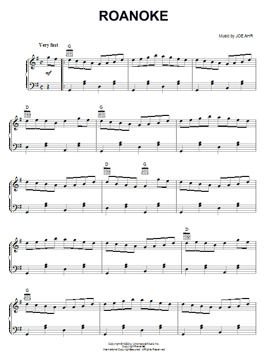 Download or print Bill Monroe Roanoke sheet music, chords and digital score arranged for Piano Solo. This Blues score includes 2 page(s).