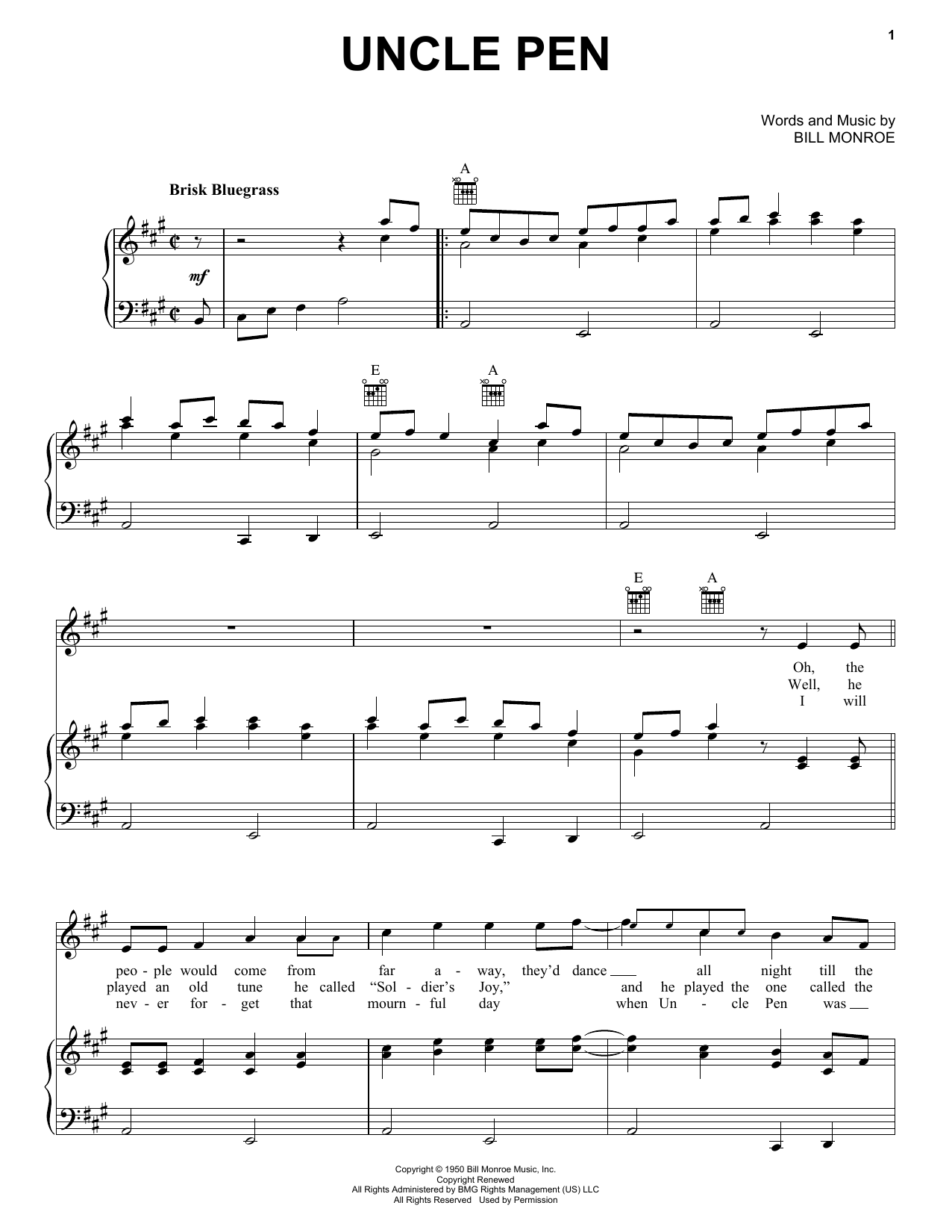 Download or print Bill Monroe Uncle Pen sheet music, chords and digital score arranged for Piano, Vocal & Guitar Chords (Right-Hand Melody). This Country score includes 3 page(s).