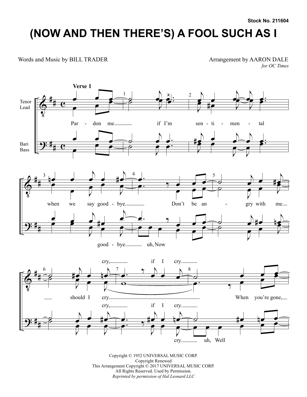 Download or print Bill Trader (Now And Then There's) A Fool Such As I (arr. Aaron Dale) sheet music, chords and digital score arranged for TTBB Choir. This Barbershop score includes 7 page(s).