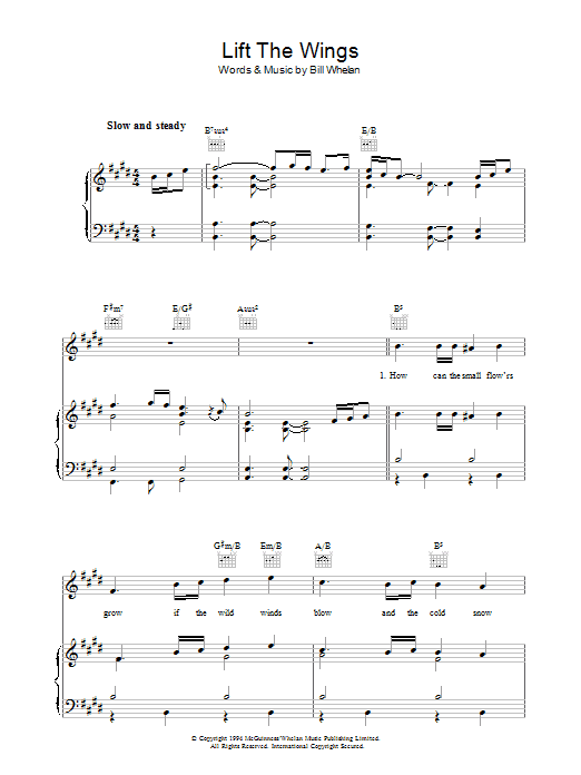Download or print Bill Whelan Lift The Wings sheet music, chords and digital score arranged for Piano, Vocal & Guitar Chords. This Pop score includes 6 page(s).