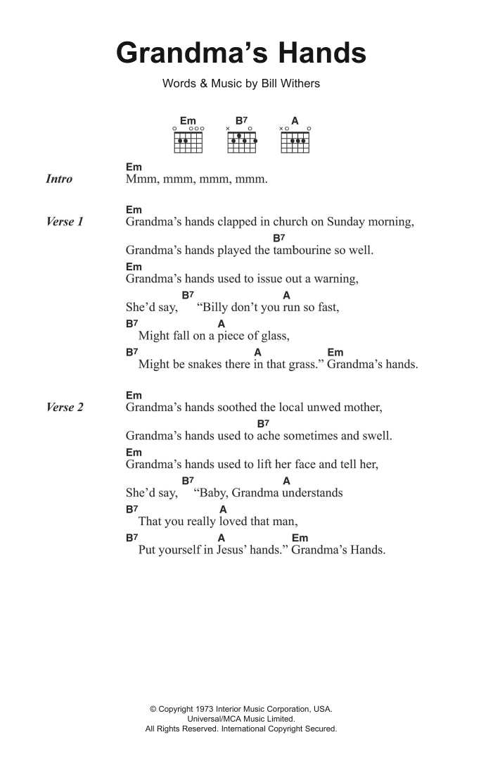 Download or print Bill Withers Grandma's Hands sheet music, chords and digital score arranged for Guitar Chords/Lyrics. This Soul score includes 2 page(s).