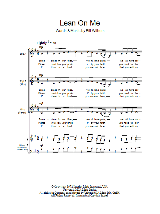 Download or print Bill Withers Lean On Me (arr. Barrie Carson Turner) sheet music, chords and digital score arranged for SSA Choir. This Pop score includes 3 page(s).