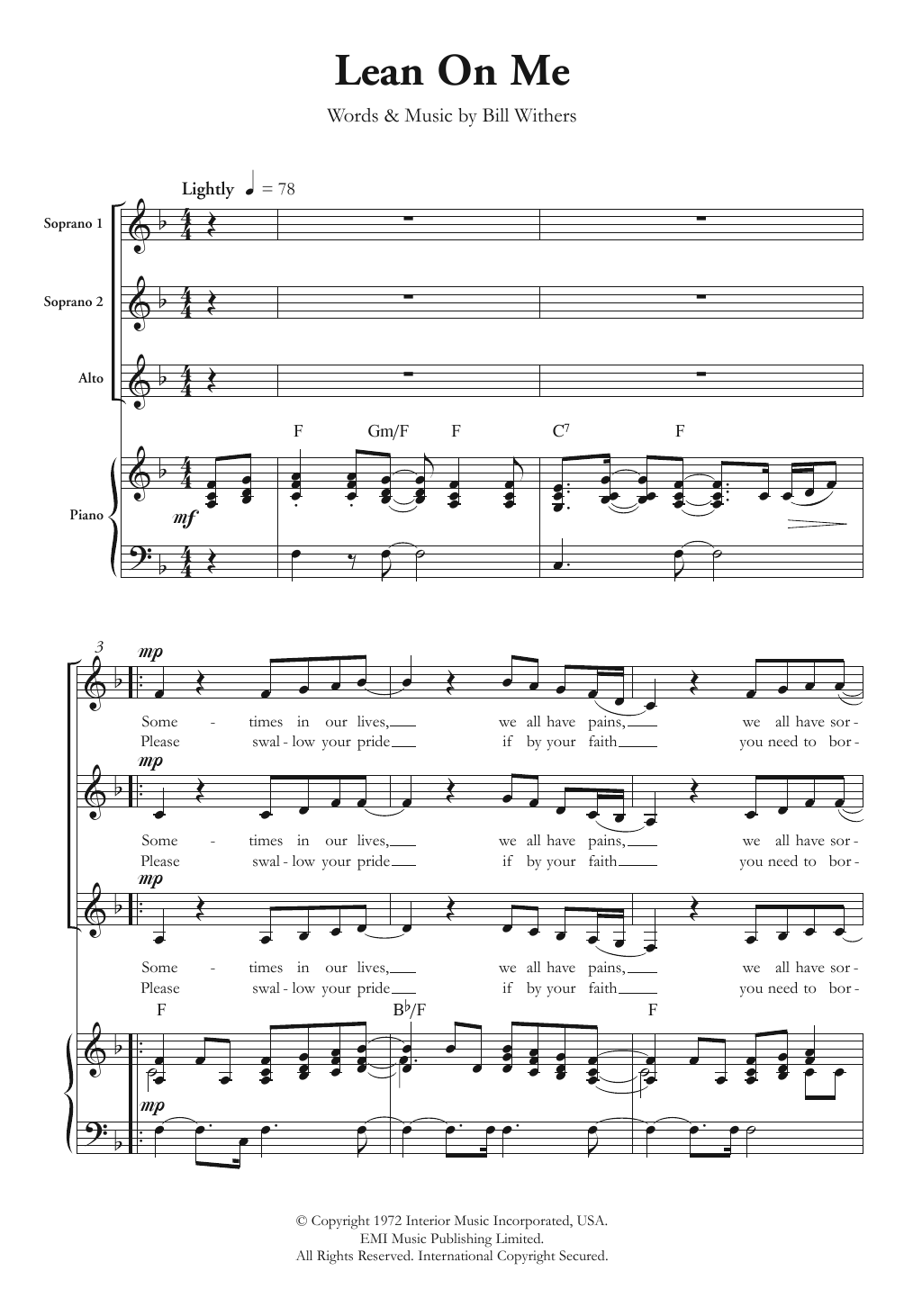 Download or print Bill Withers Lean On Me (arr. Berty Rice) sheet music, chords and digital score arranged for SSA Choir. This Pop score includes 7 page(s).