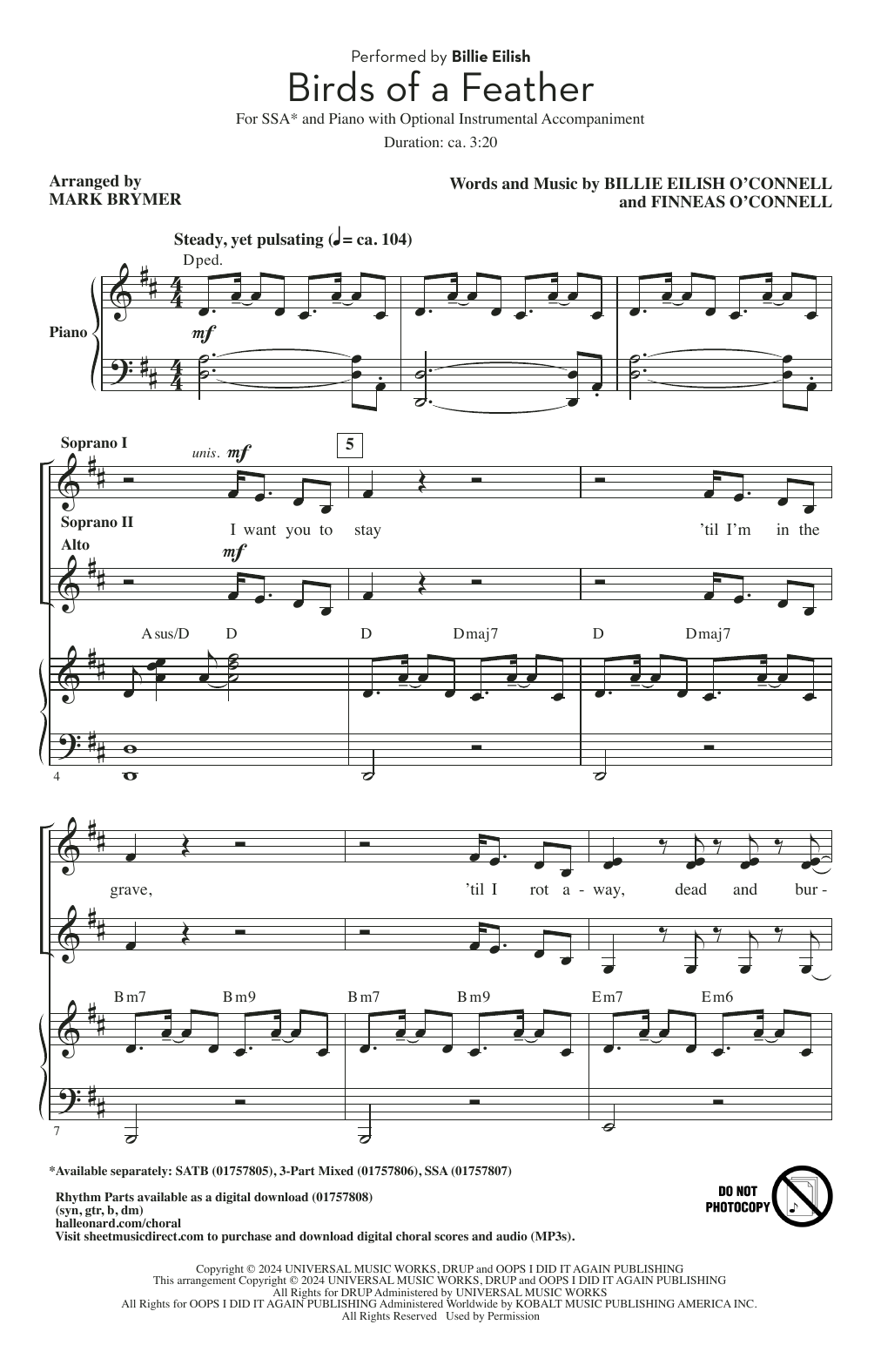 Download or print Billie Eilish Birds Of A Feather (arr. Mark Brymer) sheet music, chords and digital score arranged for SSA Choir. This Pop score includes 11 page(s).