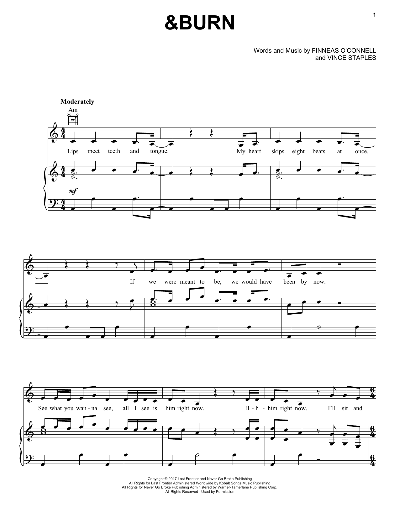Download or print Billie Eilish &burn (with Vince Staples) sheet music, chords and digital score arranged for Piano, Vocal & Guitar Chords (Right-Hand Melody). This Pop score includes 5 page(s).