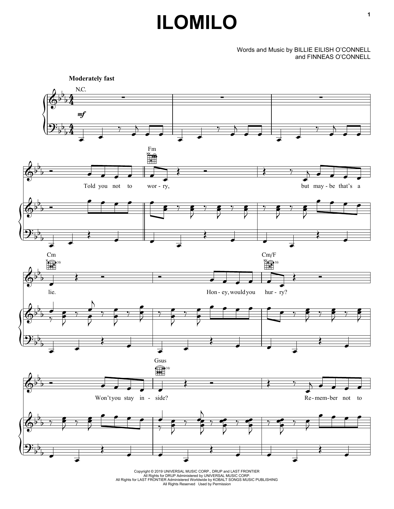 Download or print Billie Eilish ilomilo sheet music, chords and digital score arranged for Easy Piano. This Pop score includes 5 page(s).