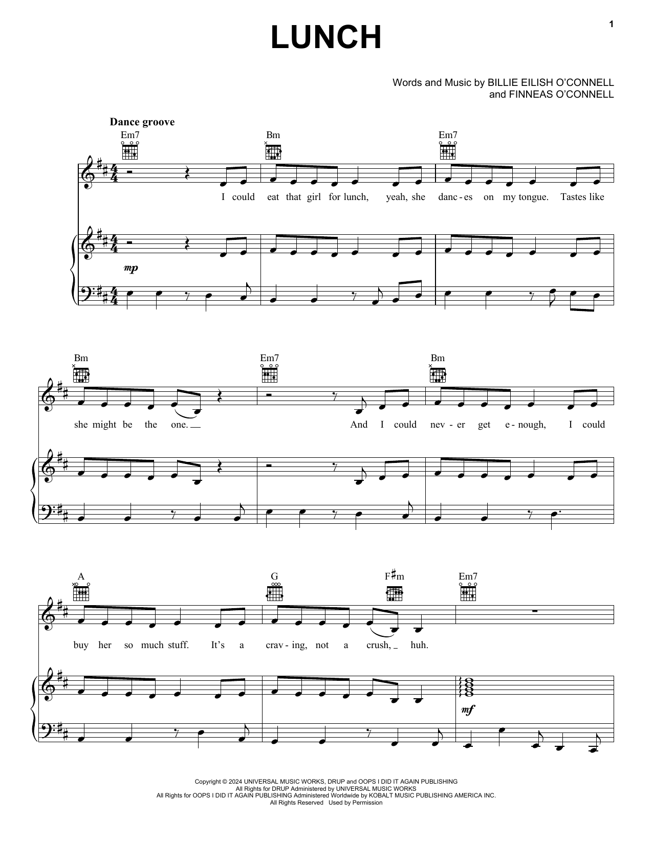 Download or print Billie Eilish LUNCH sheet music, chords and digital score arranged for Easy Piano. This Pop score includes 7 page(s).