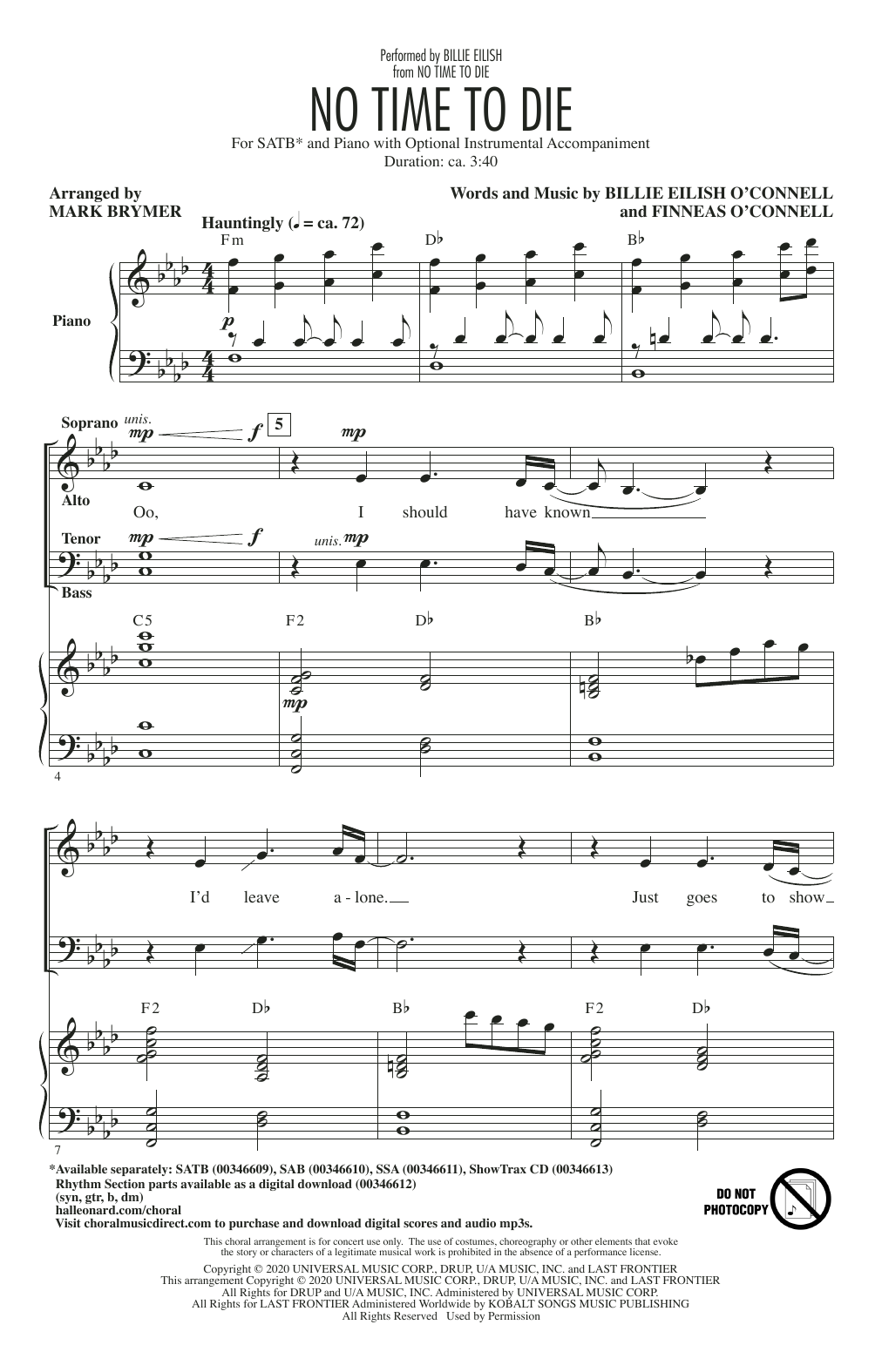 Download or print Billie Eilish No Time To Die (arr. Mark Brymer) sheet music, chords and digital score arranged for SAB Choir. This Film/TV score includes 10 page(s).