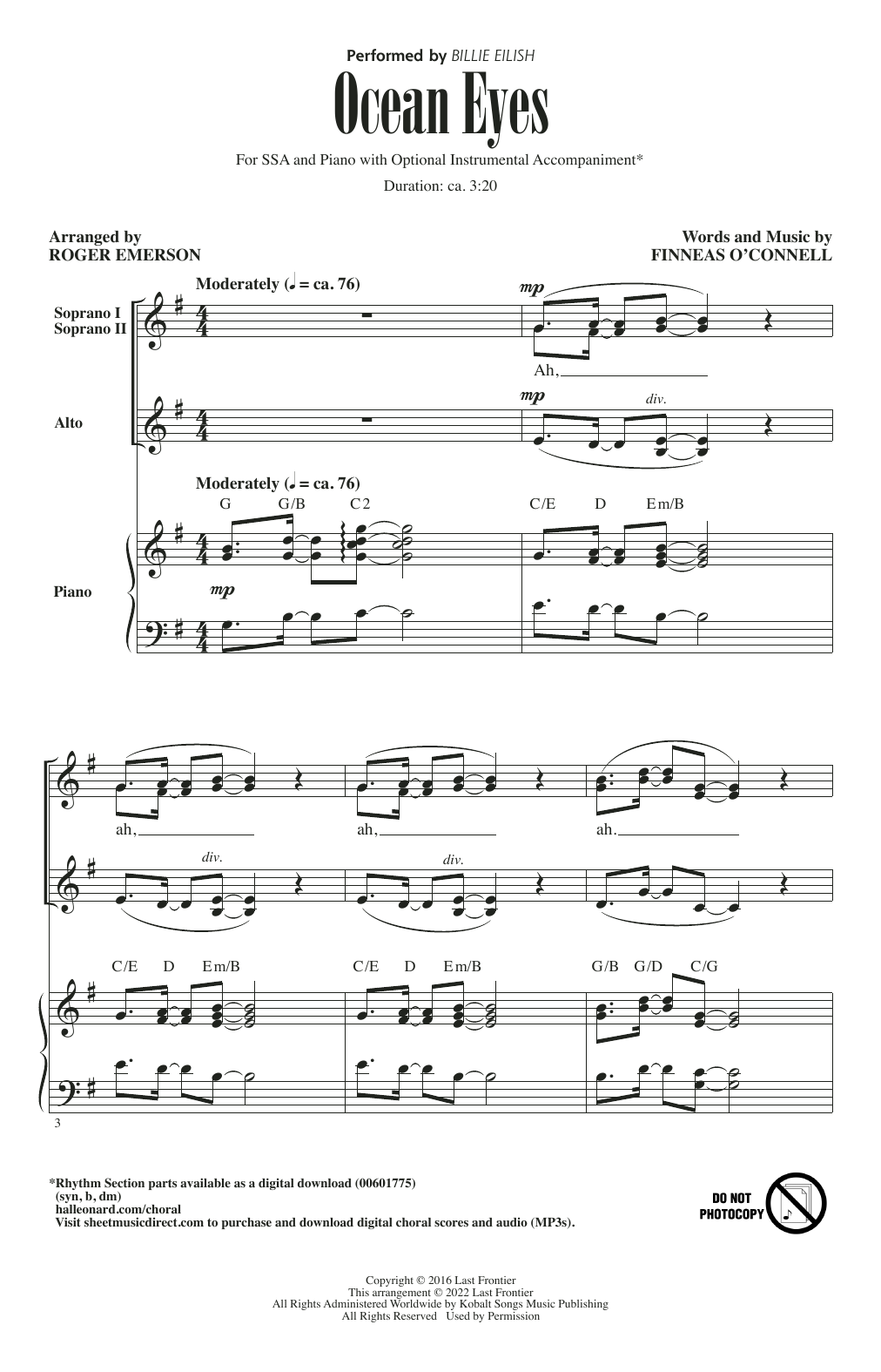 Download or print Billie Eilish ocean eyes (arr. Roger Emerson) sheet music, chords and digital score arranged for SSA Choir. This Pop score includes 10 page(s).