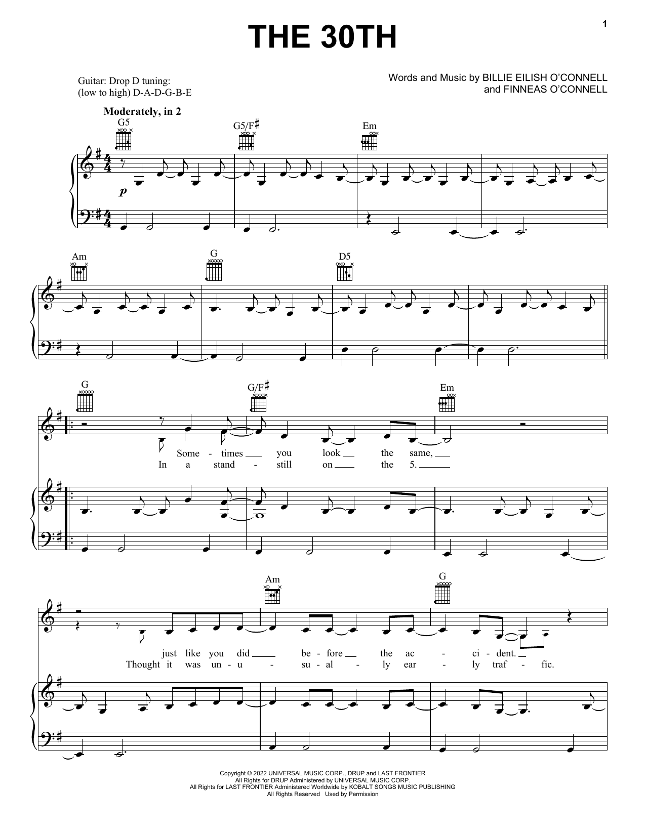 Download or print Billie Eilish The 30th sheet music, chords and digital score arranged for Piano, Vocal & Guitar Chords (Right-Hand Melody). This Pop score includes 6 page(s).