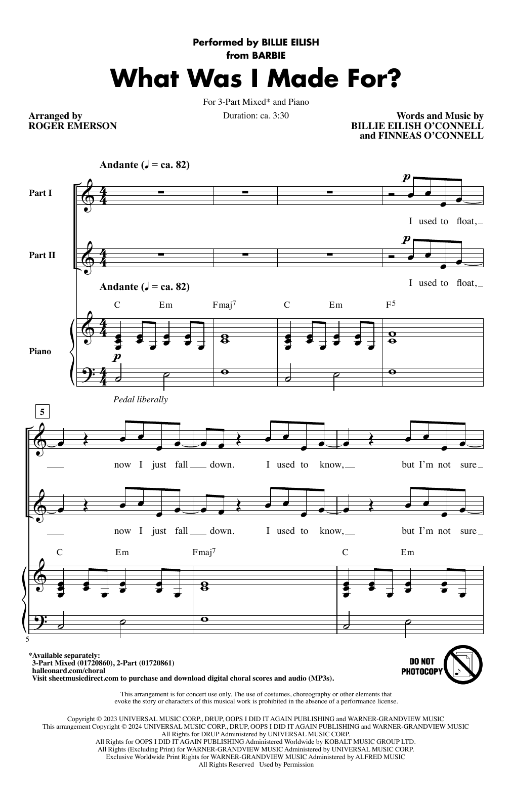 Download or print Billie Eilish What Was I Made For? (arr. Roger Emerson) sheet music, chords and digital score arranged for 3-Part Mixed Choir. This Pop score includes 10 page(s).