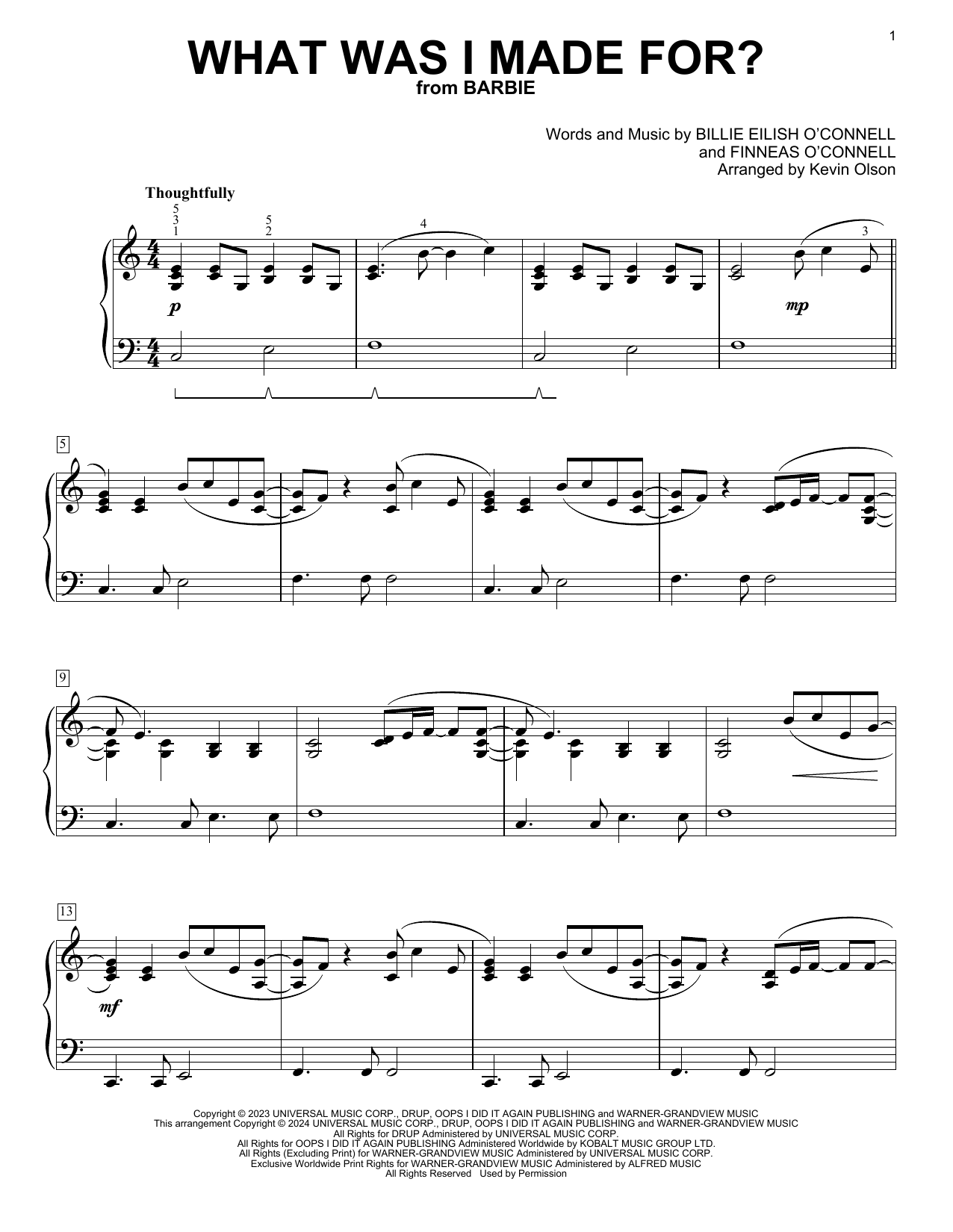 Download or print Billie Eilish What Was I Made For? (from Barbie) (arr. Kevin Olson) sheet music, chords and digital score arranged for Easy Piano Solo. This Pop score includes 3 page(s).