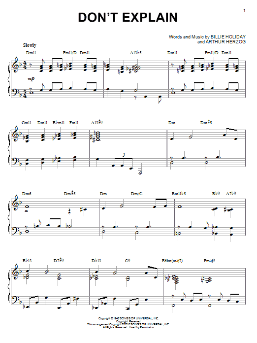 Download or print Billie Holiday Don't Explain (arr. Brent Edstrom) sheet music, chords and digital score arranged for Piano Solo. This Jazz score includes 3 page(s).