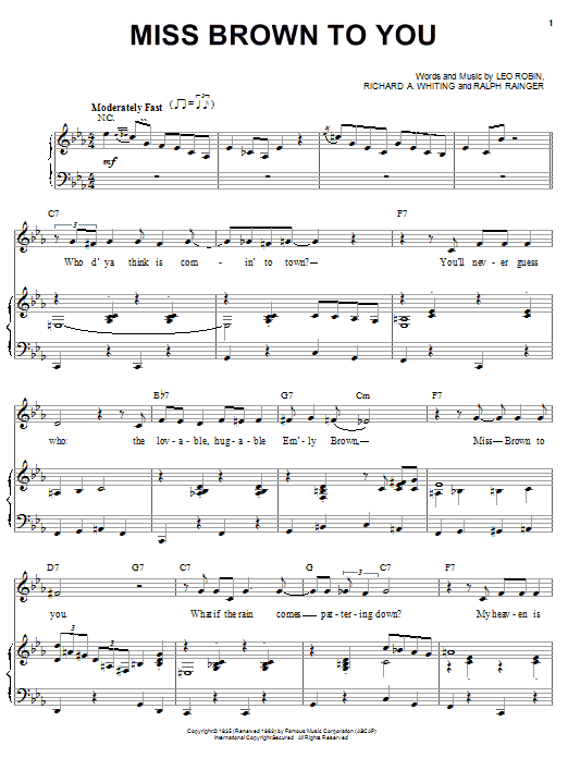 Download or print Billie Holiday Miss Brown To You sheet music, chords and digital score arranged for Piano, Vocal & Guitar Chords. This Standards score includes 4 page(s).