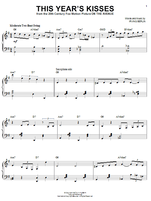 Download or print Benny Goodman This Year's Kisses sheet music, chords and digital score arranged for Piano & Vocal. This Jazz score includes 7 page(s).