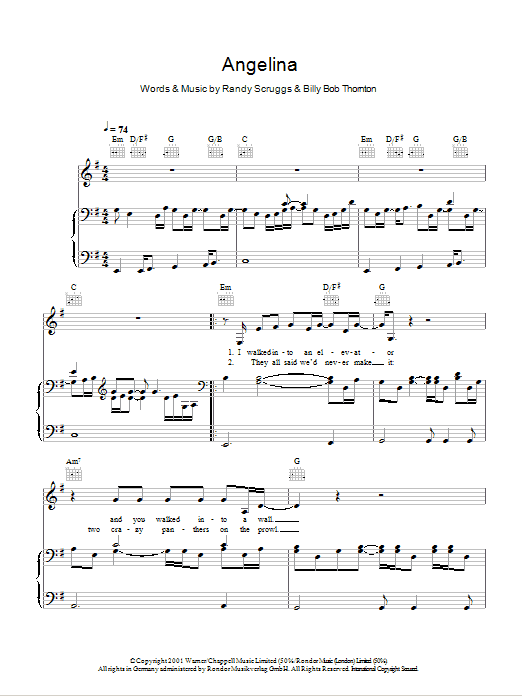 Download or print Billy Bob Thornton Angelina sheet music, chords and digital score arranged for Guitar Chords/Lyrics. This Country score includes 2 page(s).