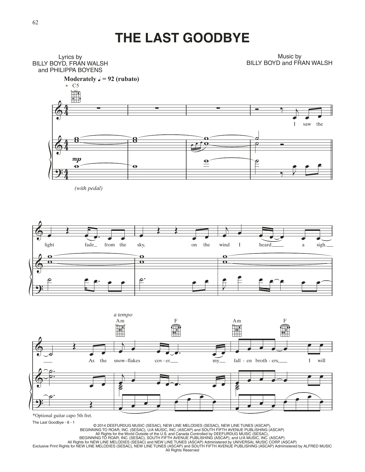 Download or print Billy Boyd The Last Goodbye (from The Hobbit: The Battle of the Five Armies) sheet music, chords and digital score arranged for Piano & Vocal. This Film/TV score includes 8 page(s).