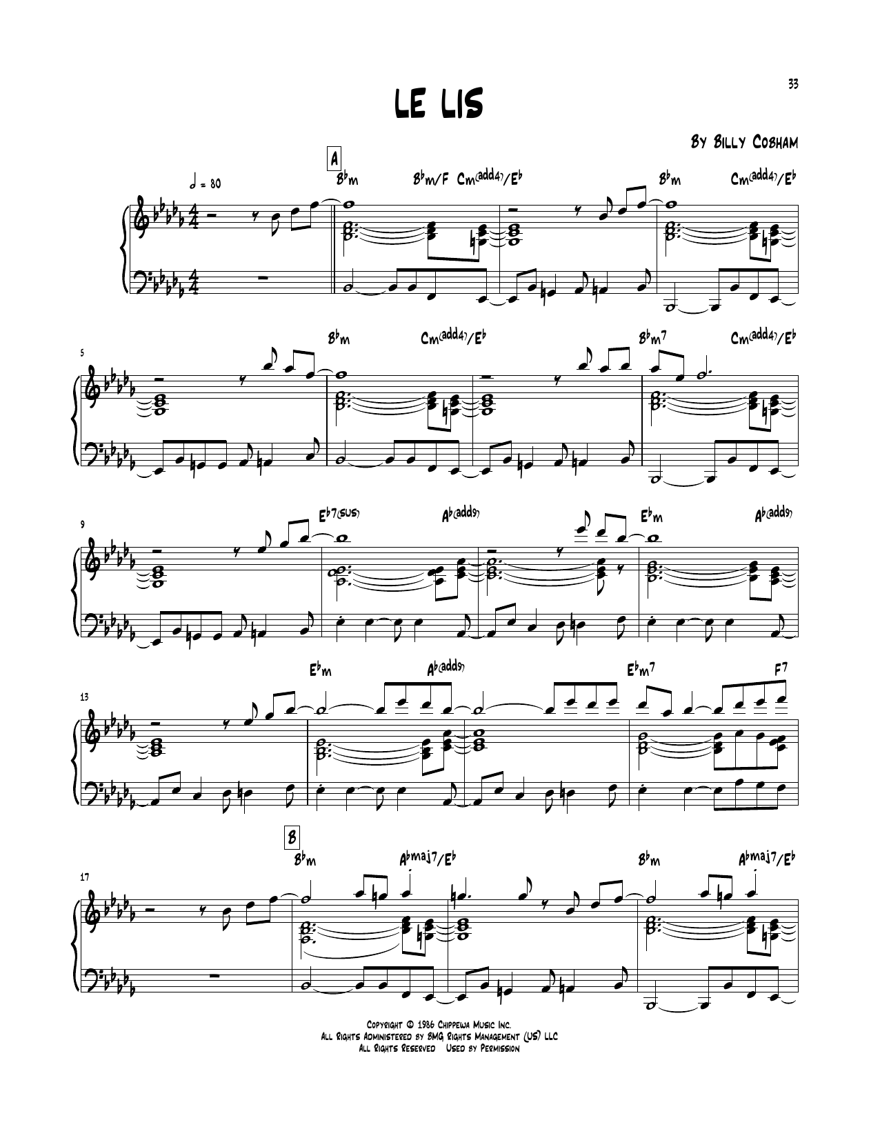 Download or print Billy Cobham Le Lis sheet music, chords and digital score arranged for Piano Transcription. This Jazz score includes 7 page(s).