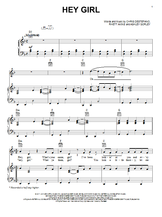 Download or print Billy Currington Hey Girl sheet music, chords and digital score arranged for Piano, Vocal & Guitar Chords (Right-Hand Melody). This Country score includes 7 page(s).