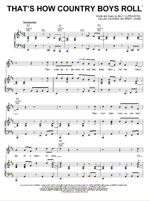 Download or print Billy Currington That's How Country Boys Roll sheet music, chords and digital score arranged for Piano, Vocal & Guitar Chords (Right-Hand Melody). This Country score includes 6 page(s).