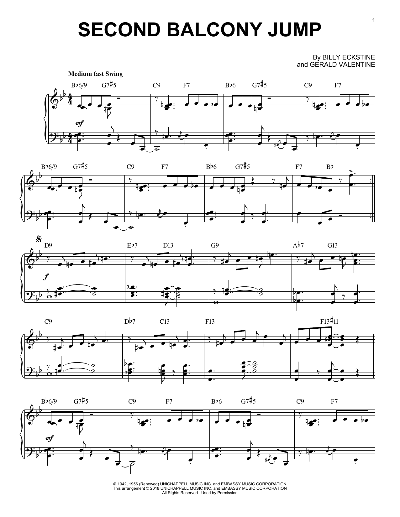 Download or print Billy Eckstine Second Balcony Jump sheet music, chords and digital score arranged for Piano Solo. This Jazz score includes 4 page(s).