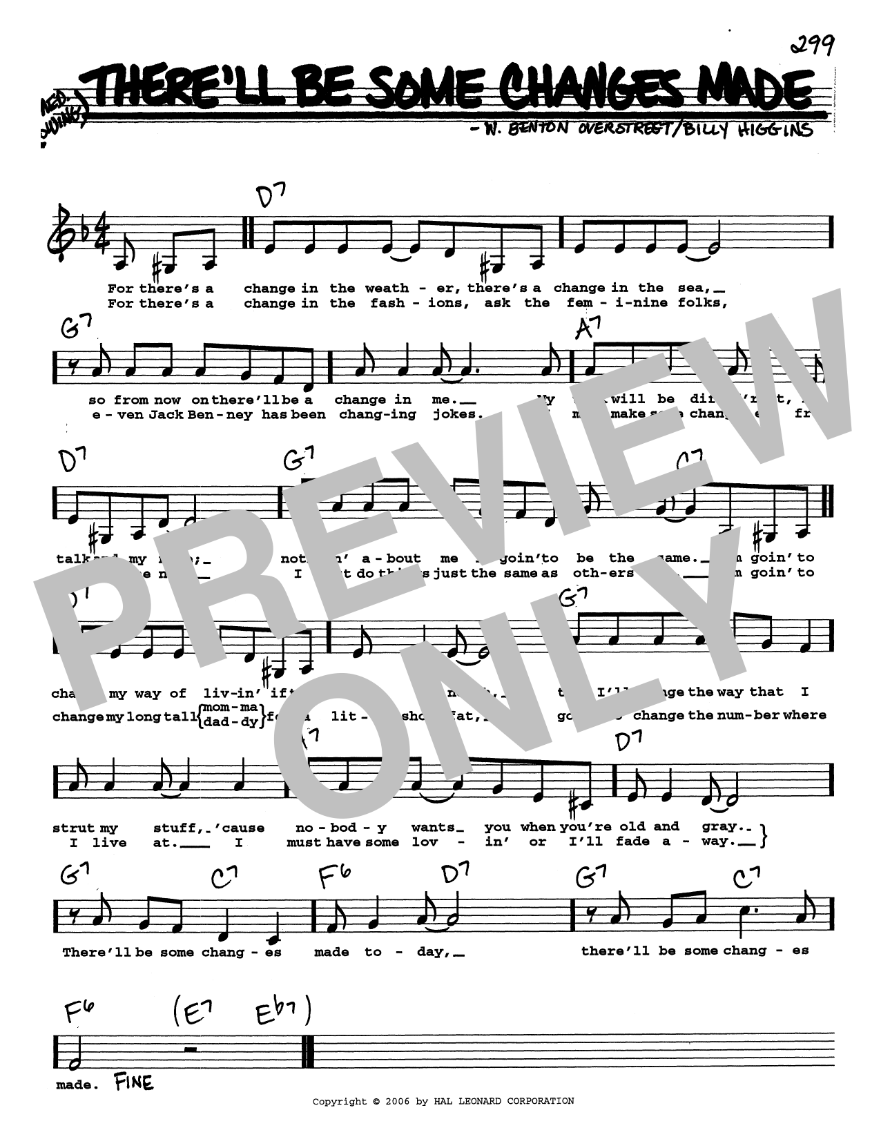 Download or print Billy Higgins There'll Be Some Changes Made (Low Voice) sheet music, chords and digital score arranged for Real Book – Melody, Lyrics & Chords. This Jazz score includes 1 page(s).