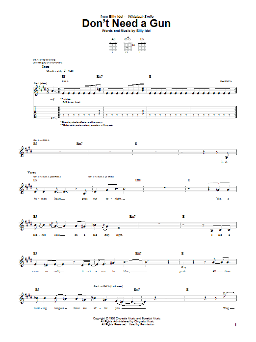 Download or print Billy Idol Don't Need A Gun sheet music, chords and digital score arranged for Guitar Tab. This Pop score includes 10 page(s).