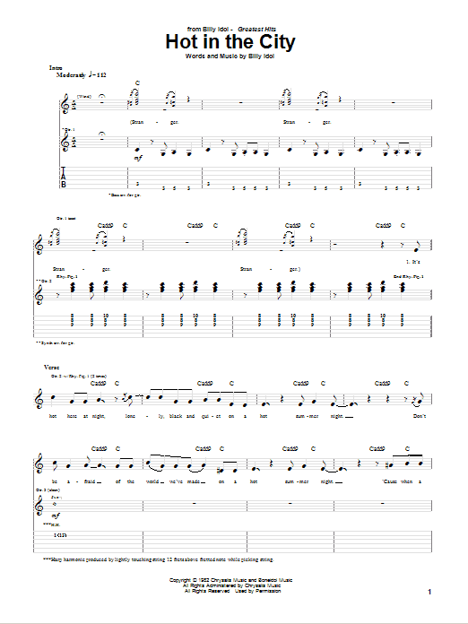Download or print Billy Idol Hot In The City sheet music, chords and digital score arranged for Guitar Chords/Lyrics. This Rock score includes 2 page(s).