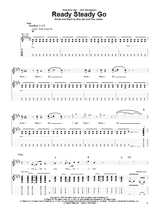 Download or print Billy Idol Ready Steady Go sheet music, chords and digital score arranged for Guitar Tab. This Pop score includes 8 page(s).