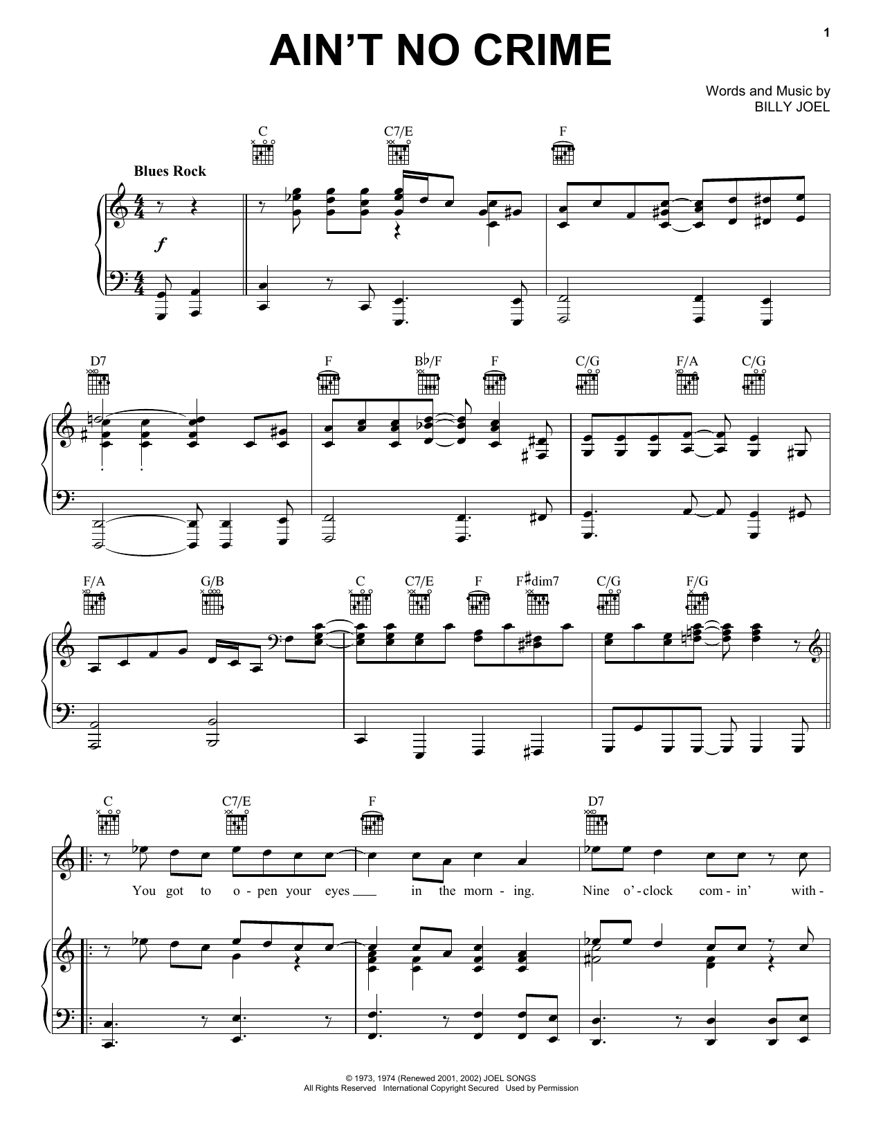 Download or print Billy Joel Ain't No Crime sheet music, chords and digital score arranged for Piano, Vocal & Guitar Chords (Right-Hand Melody). This Pop score includes 6 page(s).