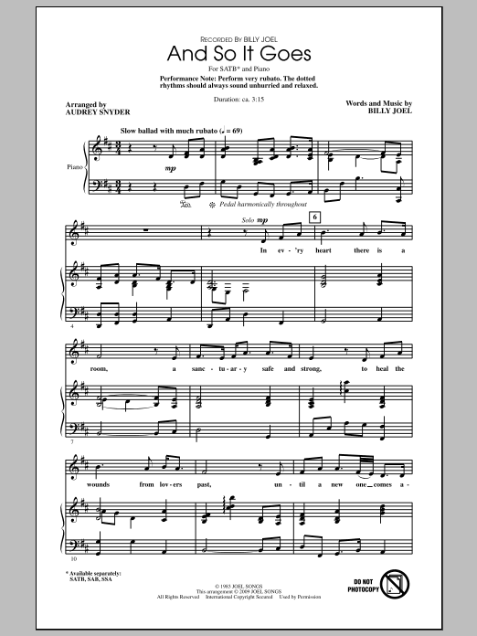 Download or print Billy Joel And So It Goes (arr. Audrey Snyder) sheet music, chords and digital score arranged for Choir. This Pop score includes 10 page(s).