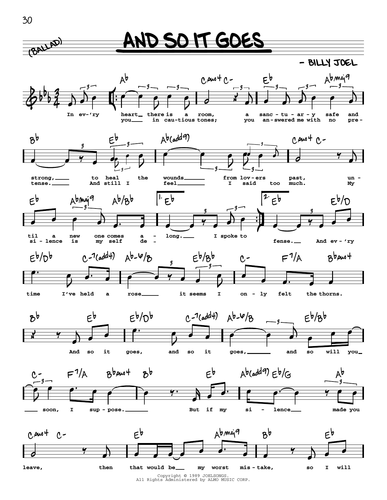 Download or print Billy Joel And So It Goes (High Voice) sheet music, chords and digital score arranged for Real Book – Melody, Lyrics & Chords. This Pop score includes 2 page(s).