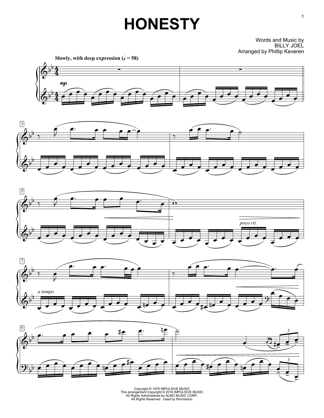 Download or print Billy Joel Honesty [Classical version] (arr. Phillip Keveren) sheet music, chords and digital score arranged for Piano Solo. This Pop score includes 4 page(s).