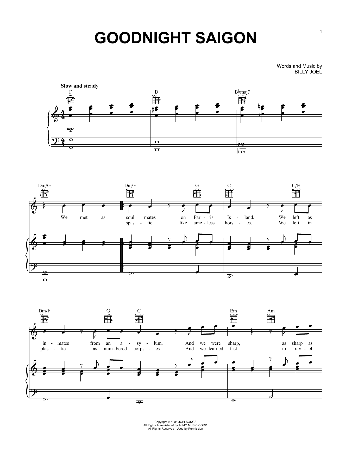 Download or print Billy Joel Goodnight Saigon sheet music, chords and digital score arranged for Piano & Vocal. This Musical/Show score includes 5 page(s).
