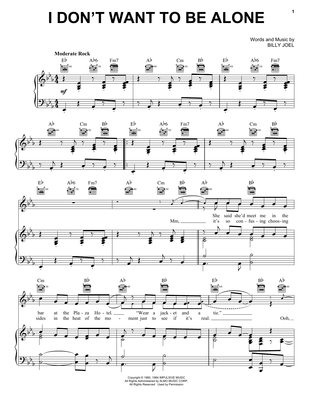 Download or print Billy Joel I Don't Want To Be Alone sheet music, chords and digital score arranged for Piano, Vocal & Guitar Chords (Right-Hand Melody). This Pop score includes 7 page(s).