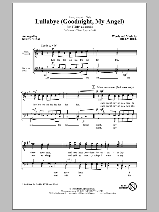 Download or print Billy Joel Lullabye (Goodnight, My Angel) (arr. Kirby Shaw) sheet music, chords and digital score arranged for SSAA Choir. This Pop score includes 5 page(s).