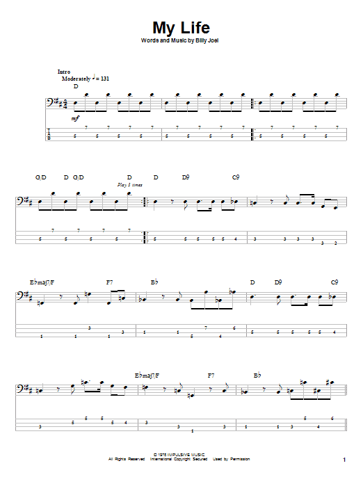 Download or print Billy Joel My Life sheet music, chords and digital score arranged for Piano, Vocal & Guitar Chords. This Pop score includes 4 page(s).