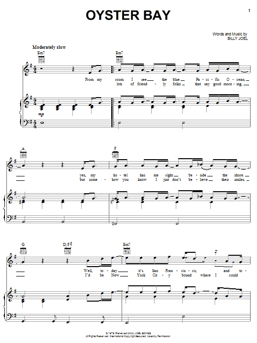 Download or print Billy Joel Oyster Bay sheet music, chords and digital score arranged for Piano, Vocal & Guitar Chords (Right-Hand Melody). This Pop score includes 5 page(s).