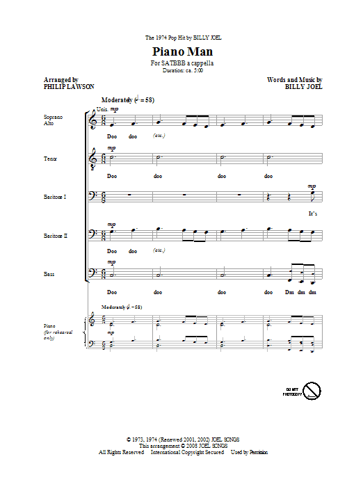 Download or print Philip Lawson Piano Man sheet music, chords and digital score arranged for SATB Choir. This Pop score includes 21 page(s).