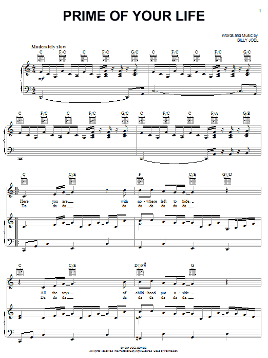 Download or print Billy Joel Prime Of Your Life sheet music, chords and digital score arranged for Piano, Vocal & Guitar Chords (Right-Hand Melody). This Pop score includes 7 page(s).