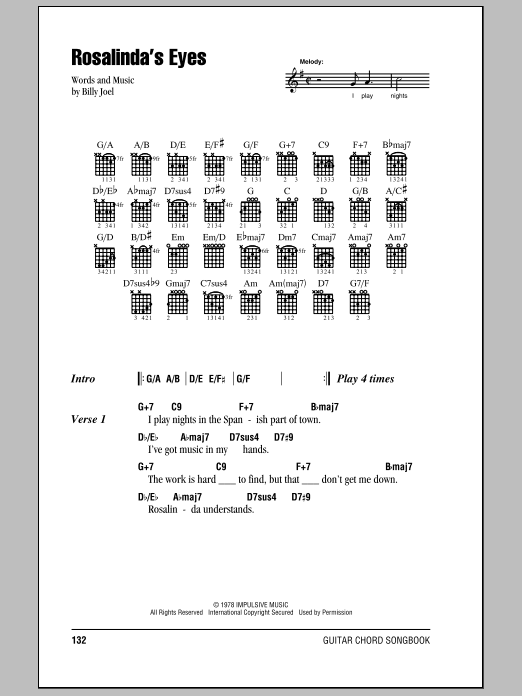 Download or print Billy Joel Rosalinda's Eyes sheet music, chords and digital score arranged for Piano, Vocal & Guitar Chords (Right-Hand Melody). This Pop score includes 12 page(s).