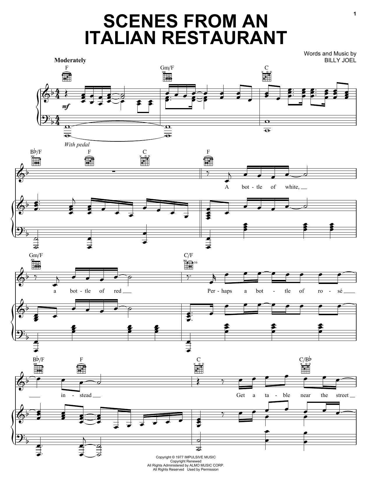 Download or print Billy Joel Scenes From An Italian Restaurant sheet music, chords and digital score arranged for Piano, Vocal & Guitar Chords (Right-Hand Melody). This Pop score includes 16 page(s).
