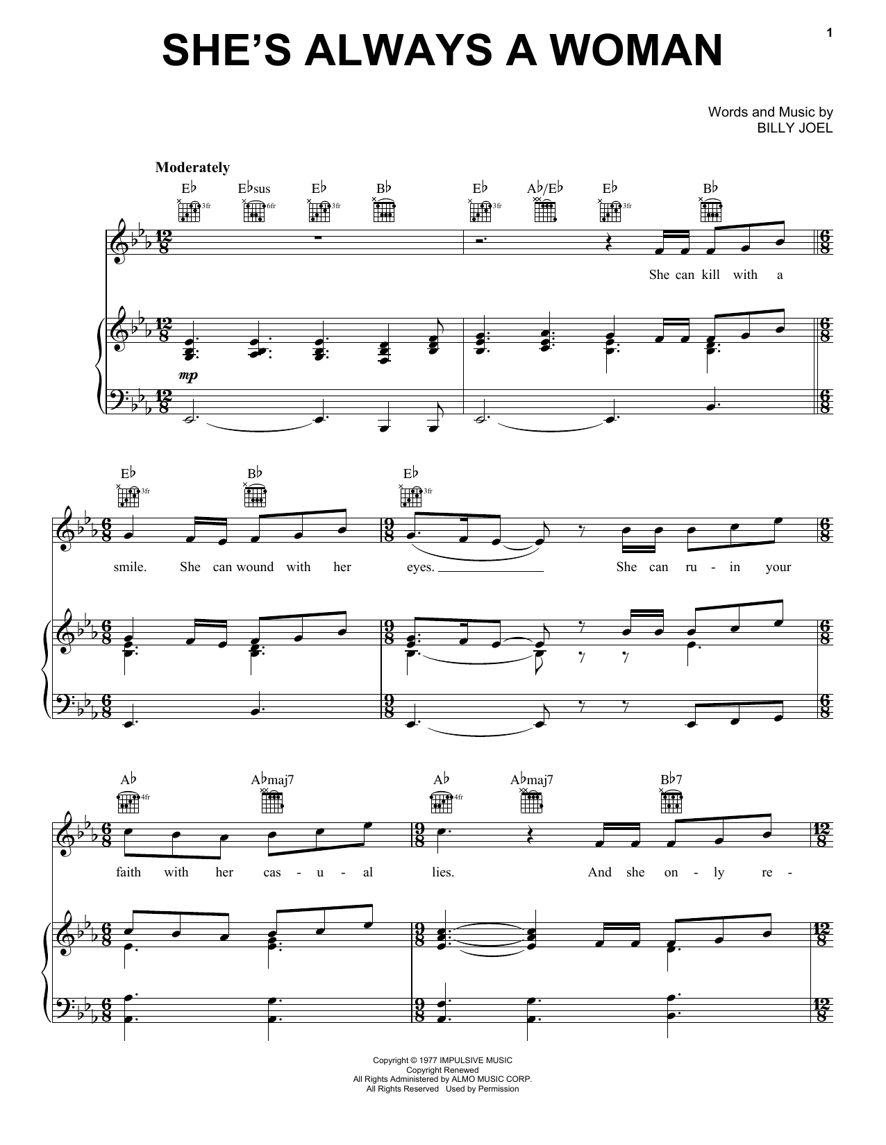 Download or print Billy Joel She's Always A Woman sheet music, chords and digital score arranged for Trumpet Solo. This Pop score includes 2 page(s).
