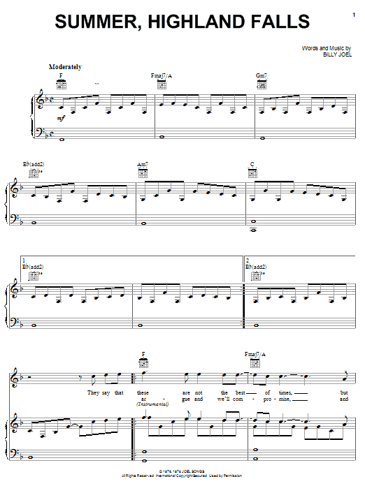 Download or print Billy Joel Summer, Highland Falls sheet music, chords and digital score arranged for Piano, Vocal & Guitar Chords (Right-Hand Melody). This Pop score includes 12 page(s).