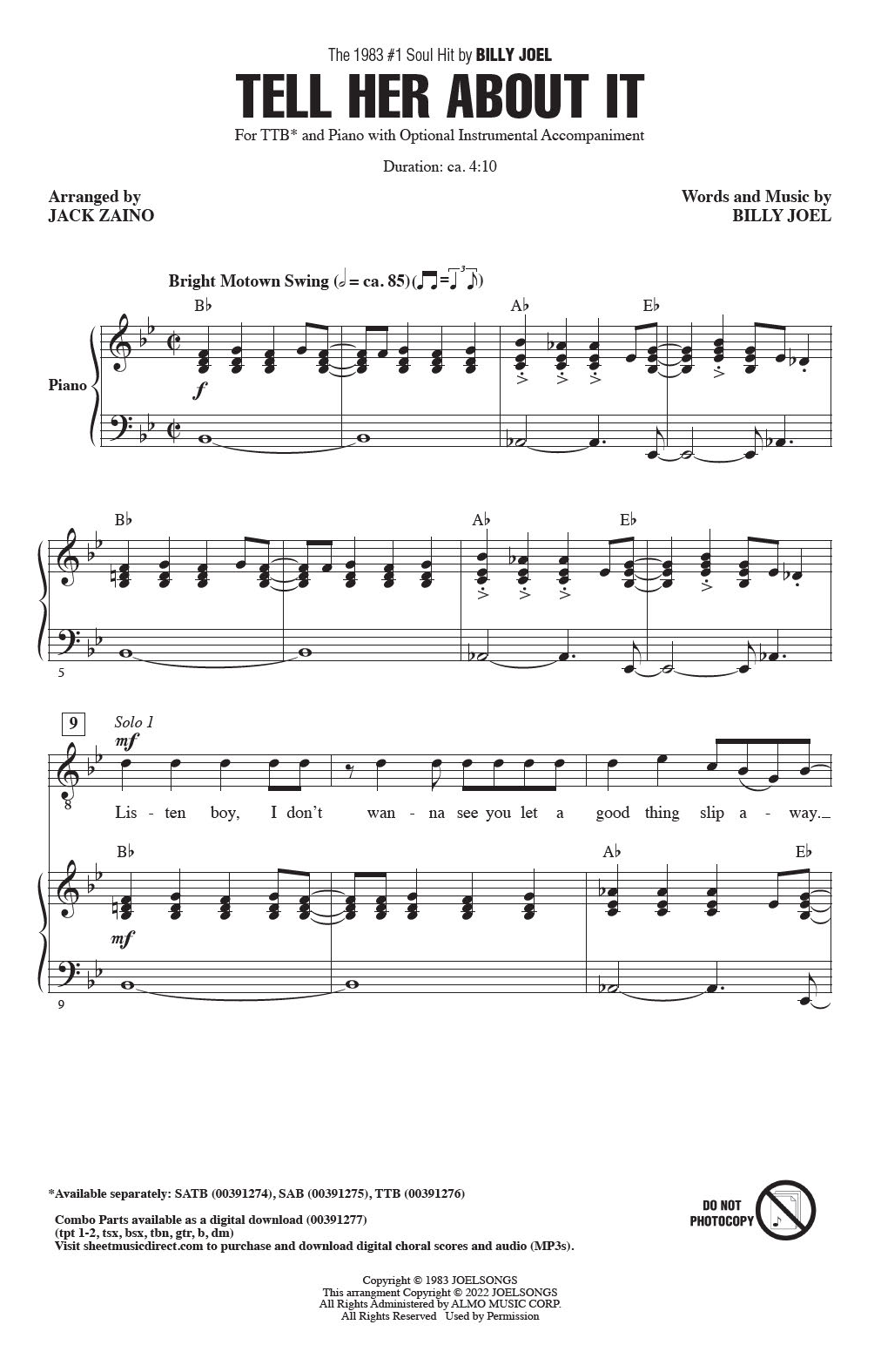 Download or print Billy Joel Tell Her About It (arr. Jack Zaino) sheet music, chords and digital score arranged for SATB Choir. This Rock score includes 19 page(s).